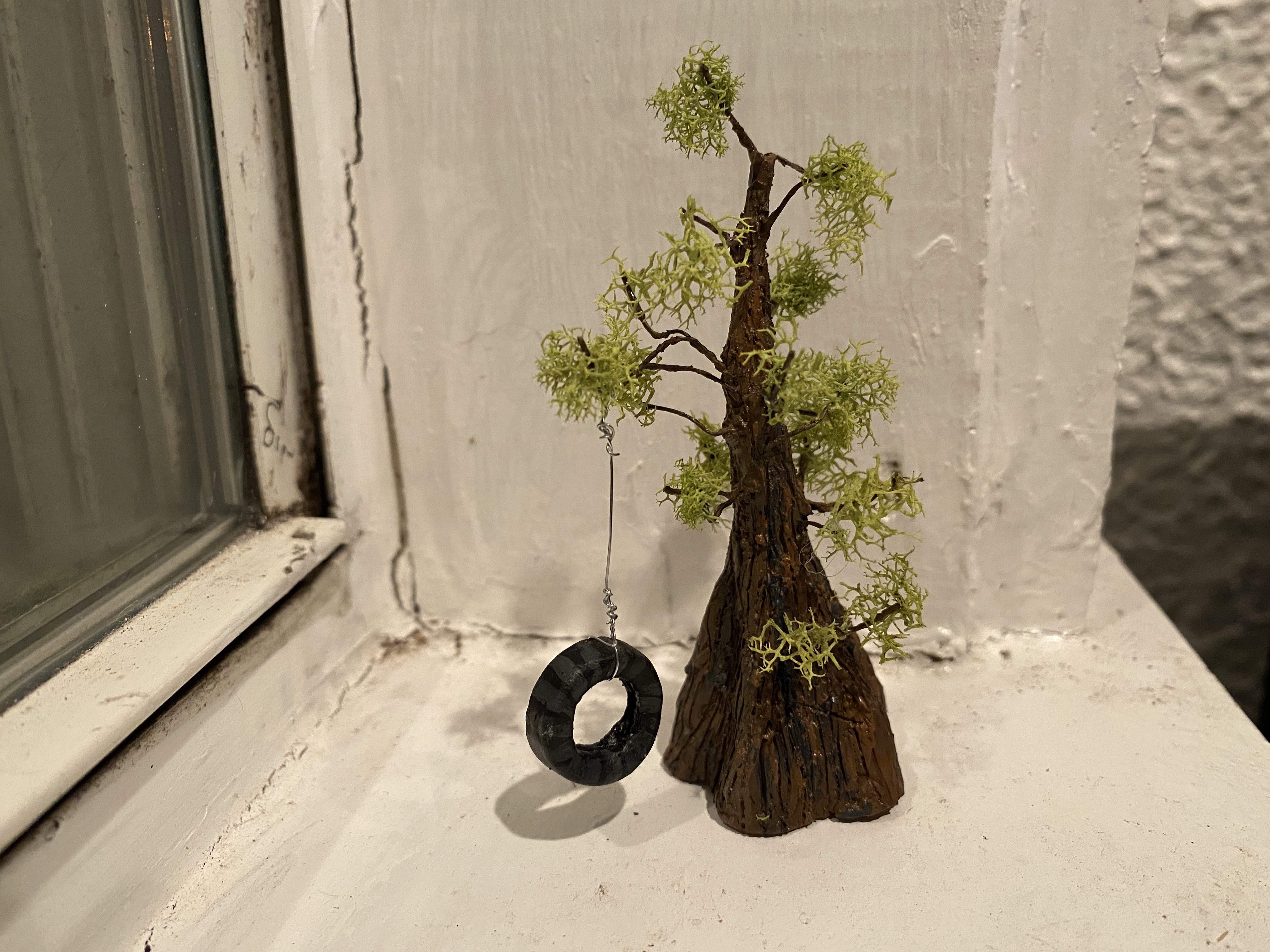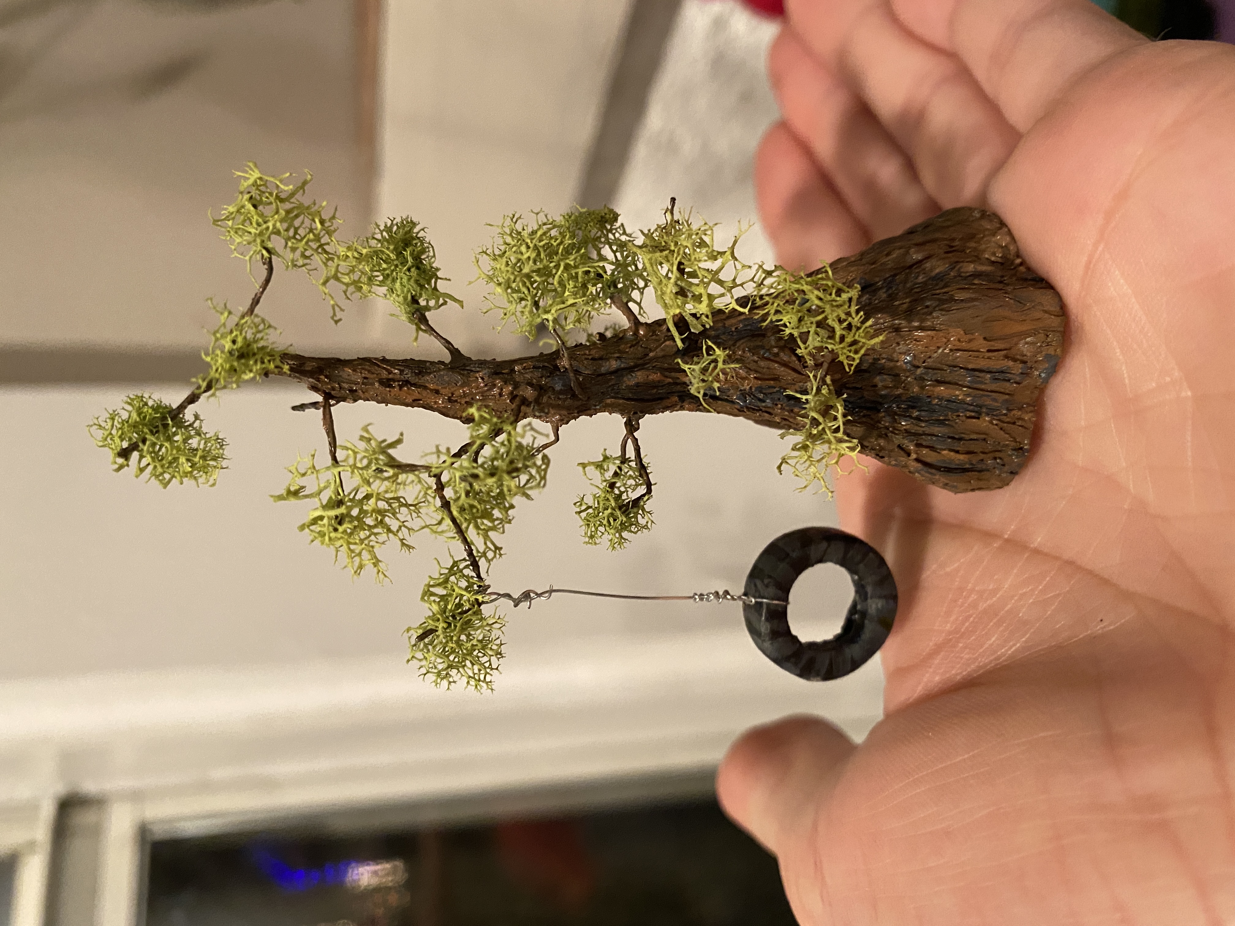 sculpey clay, acrylic paint, moss, wire